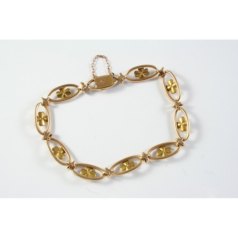 A 15CT GOLD AND TURQUOISE BRACELET each oval-shaped link is mounted with a flowerhead set with a circular turquoise cabochon, 21cm long, 14.2 grams