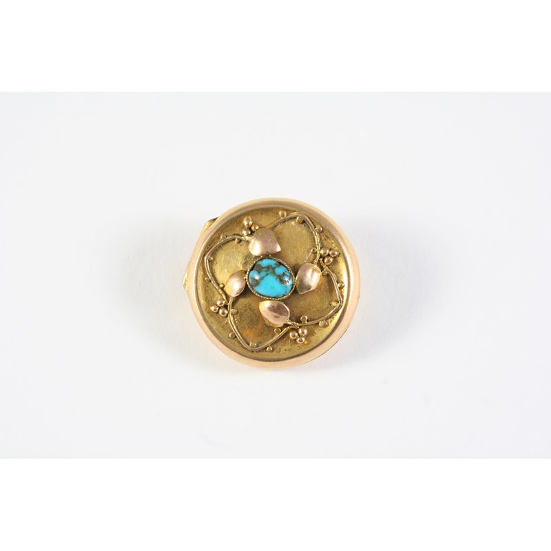 of circular form, centred with a turquoise cabochon within a border of gold foliate and ball decoration, hallmarked for Birmingham 1909, 2.5cm dia