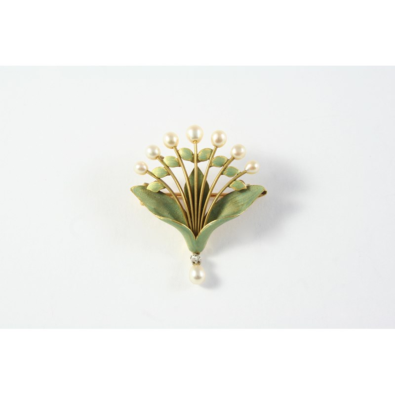 AN ART NOUVEAU ENAMEL AND PEARL FOLIATE BROOCH