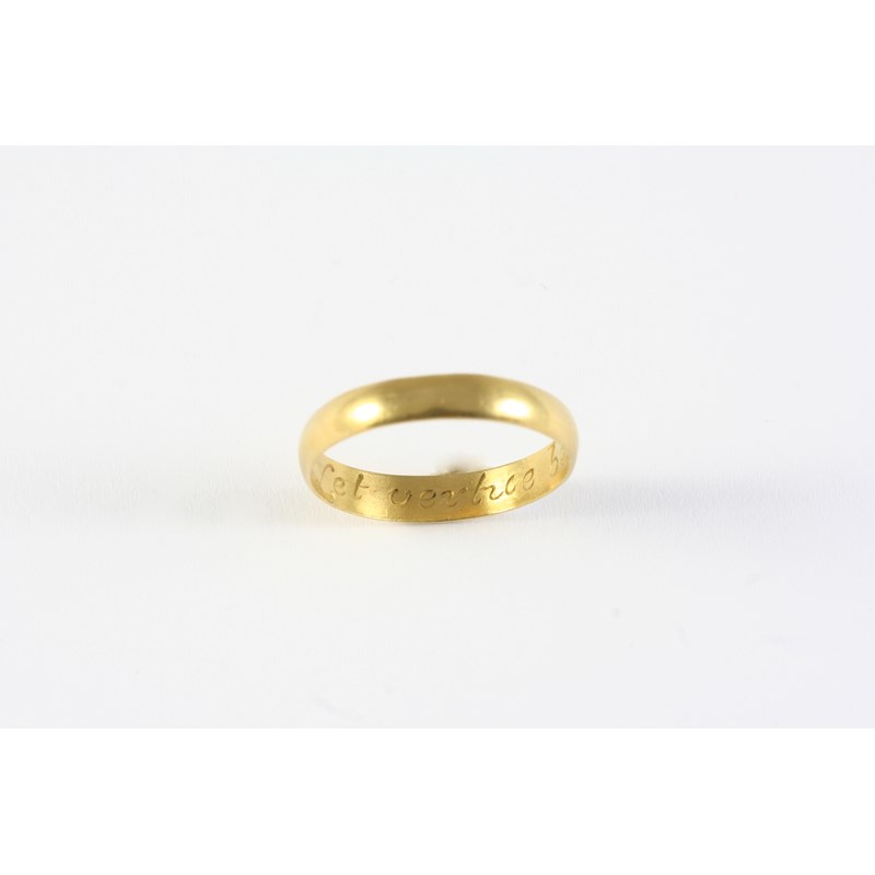 A GEORGIAN GOLD POSY RING inscribed to the inside Let Vertue Be Thy Guide, 2.9 grams. Size Q