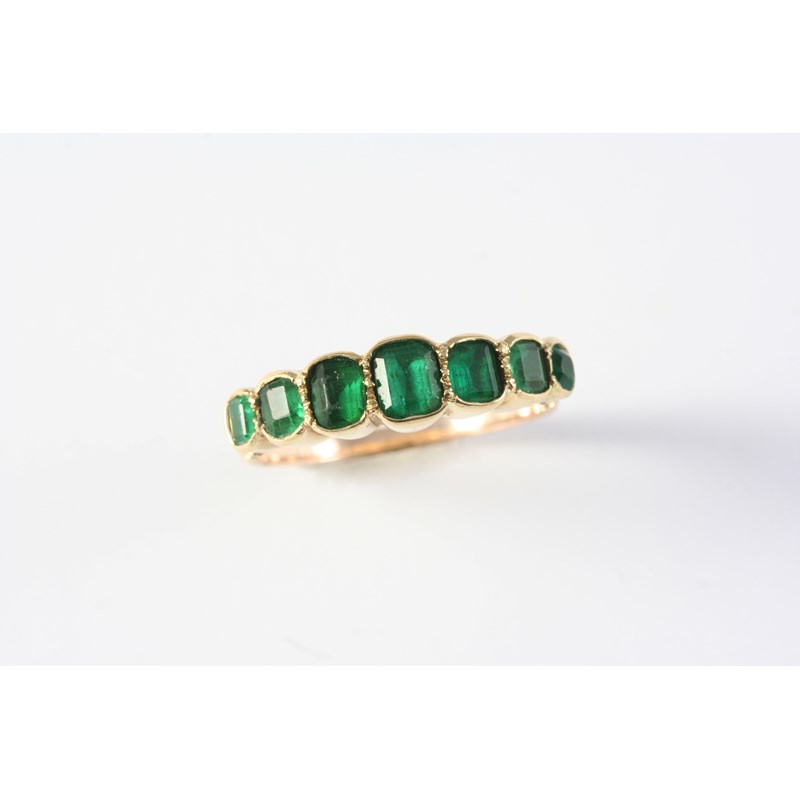 A GEORGIAN EMERALD HALF HOOP RING the seven graduated foil backed emeralds are set in gold closed back settings, with engraved foliate decoration to each shoulder. Size M 1/2