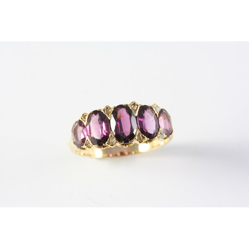 A GARNET AND DIAMOND RING the five graduated oval-shaped garnets are set with rose-cut diamond highlights in gold. Size O