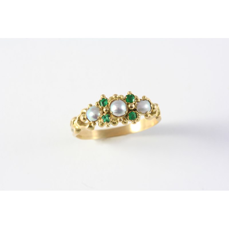 A GEORGIAN EMERALD AND PEARL RING the ornate gold mount is set with three graduated half pearls and four emeralds, in closed-back gold settings. Size K 1/2