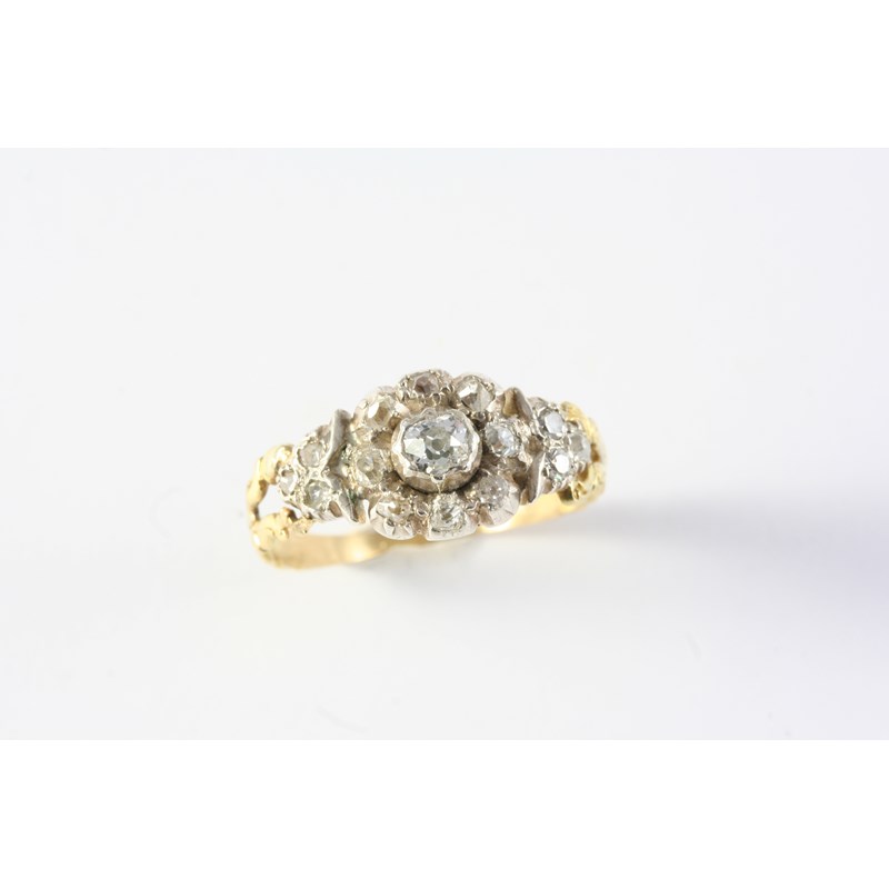 A LATE VICTORIAN DIAMOND CLUSTER RING of flowerhead form, set overall with circular old cut and rose-cut diamonds, in gold. Size L