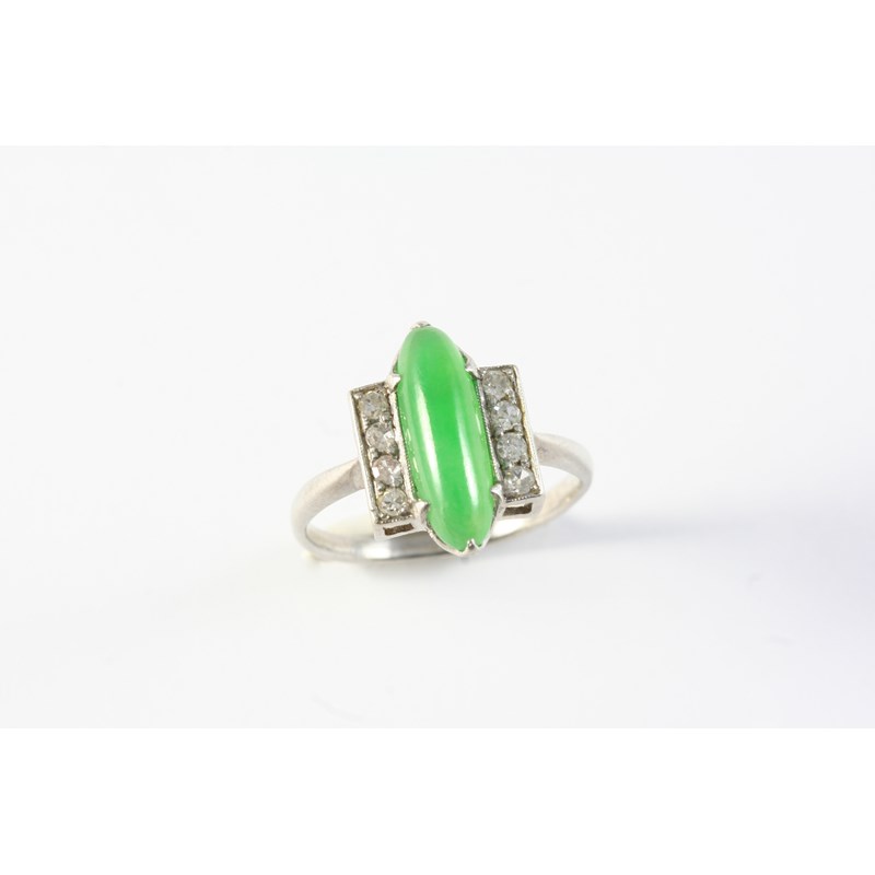 AN ART DECO JADE AND DIAMOND RING the lozenge-shaped jade is millegrain set with four single-cut diamonds to each shoulder, in platinum. Size M