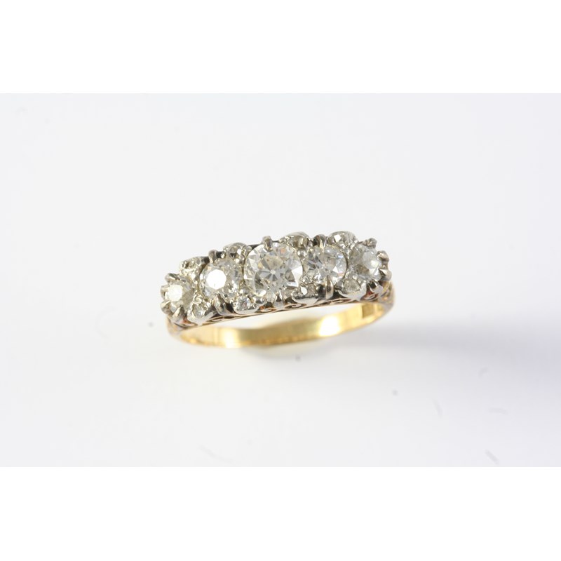 the five graduated old circular-cut diamonds are set with rose-cut diamond highlights in silver and 18ct gold. Size K 1/2