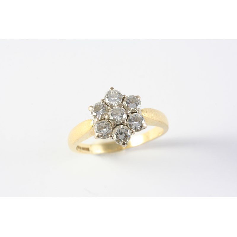 A DIAMOND CLUSTER RING the flowerhead design is set with seven circular-cut diamonds in 18ct gold. Size M 1/2