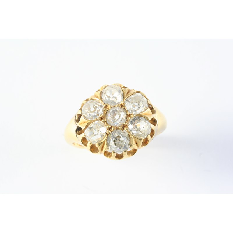 A DIAMOND CLUSTER RING the flowerhead design is set with seven old cushion-shaped diamonds, in yellow gold. Size F