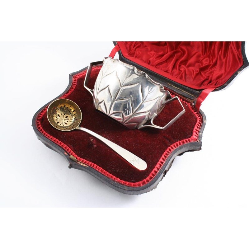 decorated with a leaf design, angular handles & matching sugar sifter ladle, both initialled, by J.T. Heath & J.H. Middleton, London/Birmingham 1897 (fitted case); the bowl 4.5" (11 cms) diameter; 5.5 oz