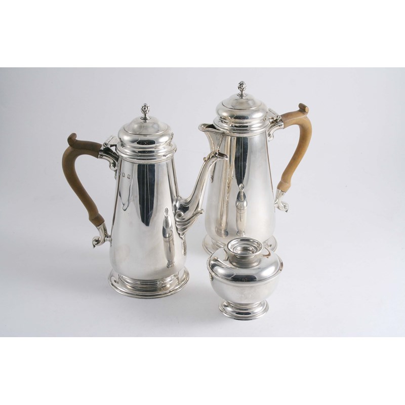 A MODERN COFFEE POT matching hot water jug & covered sugar bowl, by Naylor Brothers, London 1964; pot & jug 9" (23 cms) high; 47.3 oz (3)