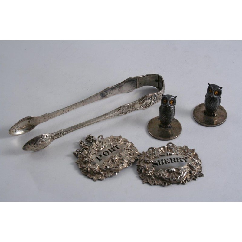 with coloured glass eyes, by S. Mordan & Co., Chester 1905, a pair of sugar tongs and two decorative wine labels pierced "PORT" & "SHERRY" by C. Reily &G. Storer, London 1842; the owls 1.25" (3 cms) high; 4.7 oz (5)
