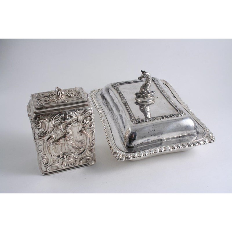 with embossed decoration & a hinged cover and a plated entree dish & cover with heraldic crest finial; the caddy 5.8" (14.8 cms) high (2)