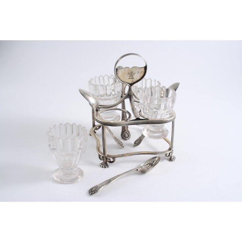 of waisted square form with a reeded ring handle, by Joseph Craddock, London 1825, fitted with four cut glass egg cups & a set of four Hourglass pattern egg spoons, by William Chawner, London 1825; the frame & spoons crested to match; 6" (15.2 cms) high; 11.9 oz weighable silver