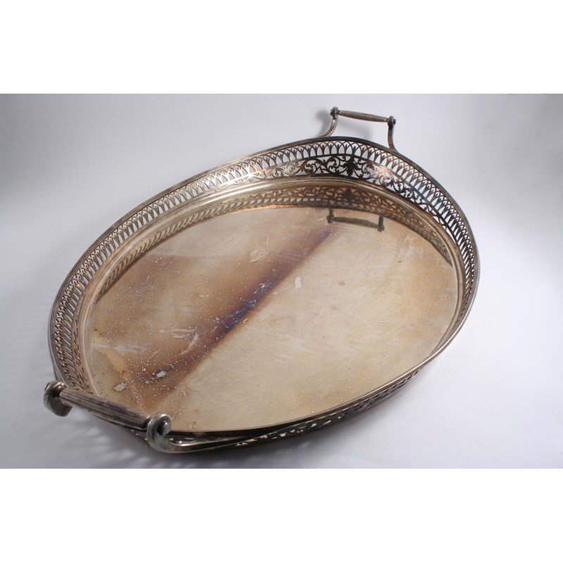 A LATE VICTORIAN ELECTROPLATED TWO HANDLED OVAL TEA TRAY with a pierced gallery & a reeded rim c.1885; 27.5" (70 cms) long