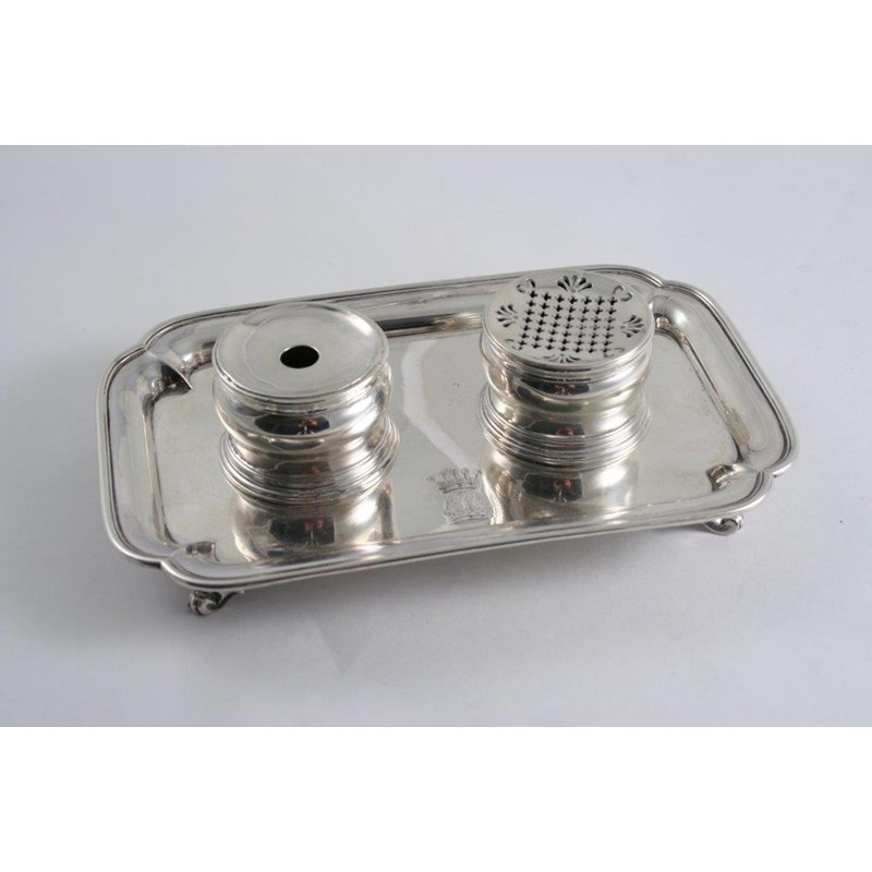 oblong with incurved corners & shaped bracket feet, with two lift-off, baluster receivers, engraved with the crest* & coronet of an Earl, by Peter Archambo, London 1733; 8.25" (21 cms) long; 17.2 oz