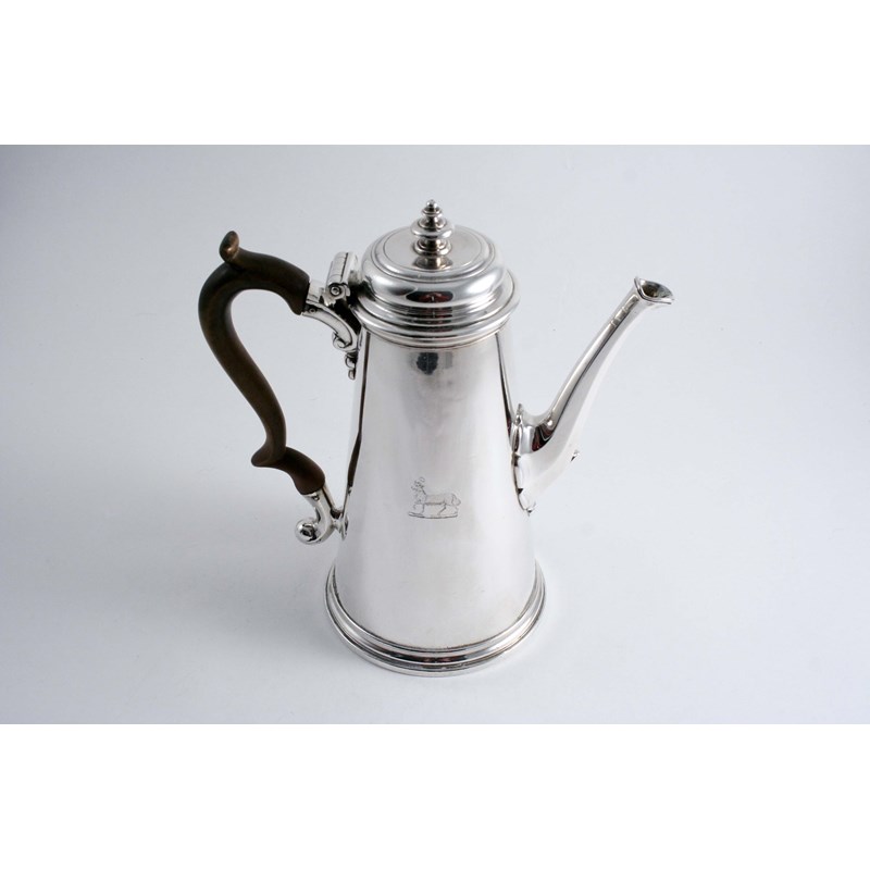 of tapering form with a skirted base, octagonal spout & a cushion-domed cover with a knop finial, crested, the base with scratchweight "28-8", by John Swift, London 1732; 8.8" (22.6 cms) high; 29.2 oz