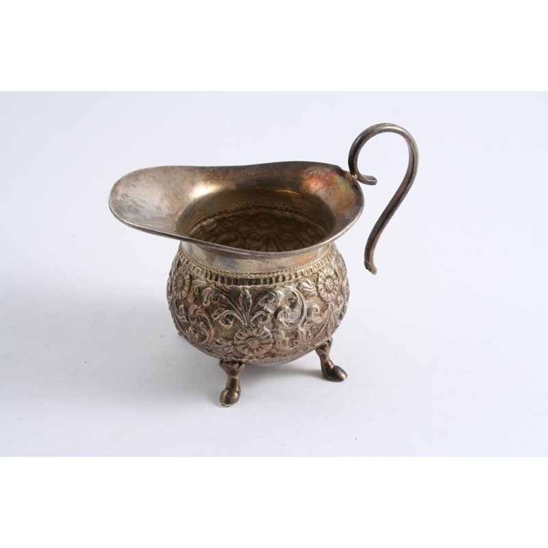 AN INDIAN CREAM JUG with four feet, chased end embossed decoration, stamped T100 (for highest purity); 3.75" (9.6 cms) high; 5 oz