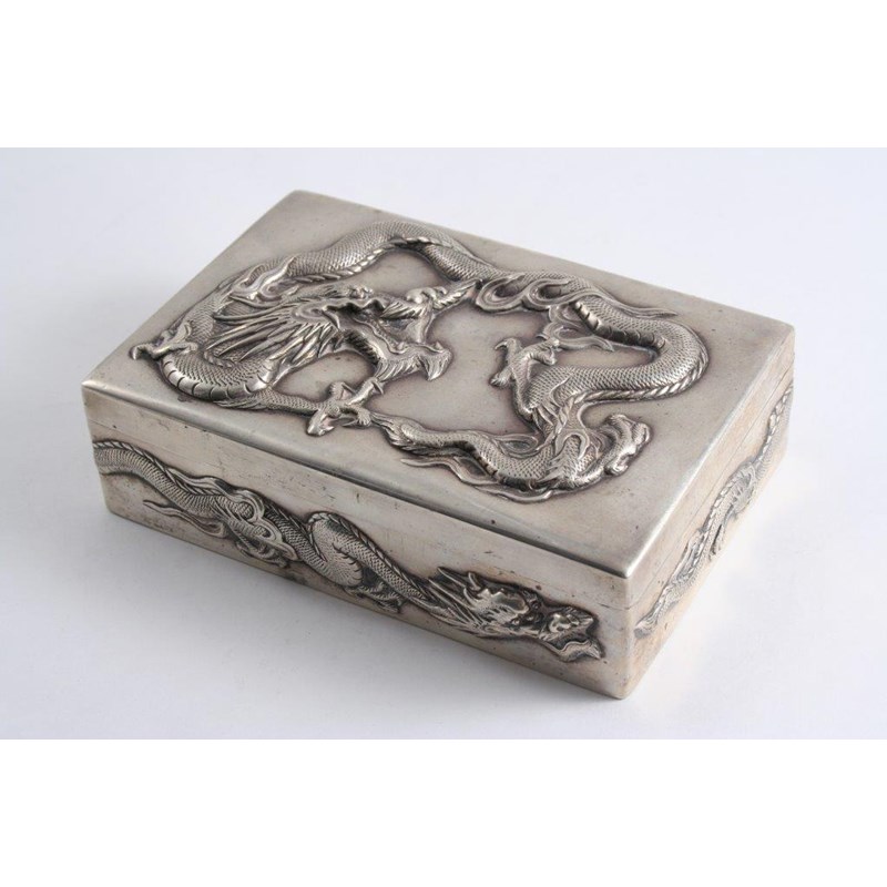 embossed around the sides & on the cover with dragons in relief, maker's mark "WN" & Chinese character mark, the interior velvet-lined, c.1900; 5.9" (15 cms) long; 13.5 oz gross