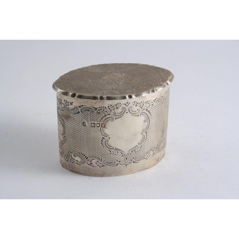 with a scalloped border around the cover, decorated with engine-turning bordered by engraved scrollwork, two vacant cartouches, by Messrs. Hutton, London 1908; 4.25" (10.7 cms) wide; 6.6 oz