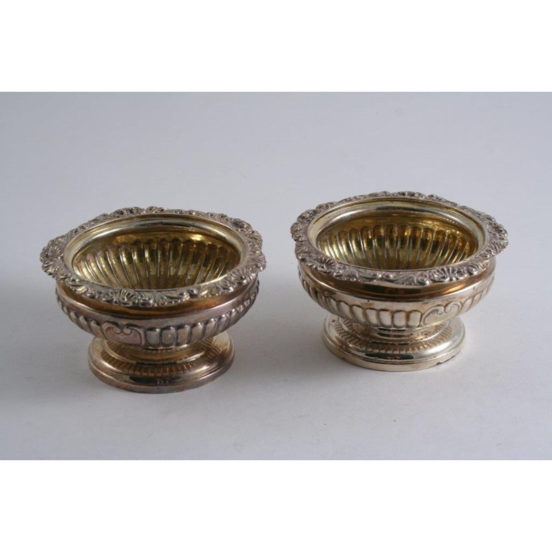 with part-fluting, pedestal bases & foliate shell borders (gilt interiors), by Thomas Burwash, London 1821; 3.75" (9.5 cms) diameter; 10.4 oz 92)