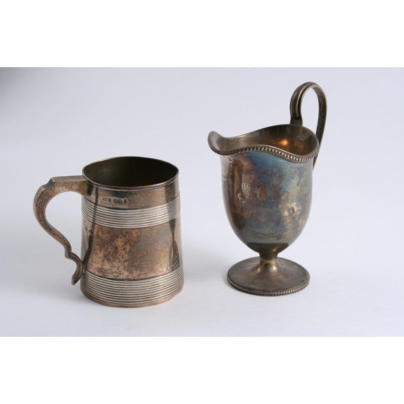 with bead borders & a circular pedestal foot (loaded), crested, by Alexander Field, London 1779 and a George III mug with two bands of reeding by Joseph Dodds, London 1793; the latter 3.3" (8.5 cms) high; 7.2 oz weighable silver (2)