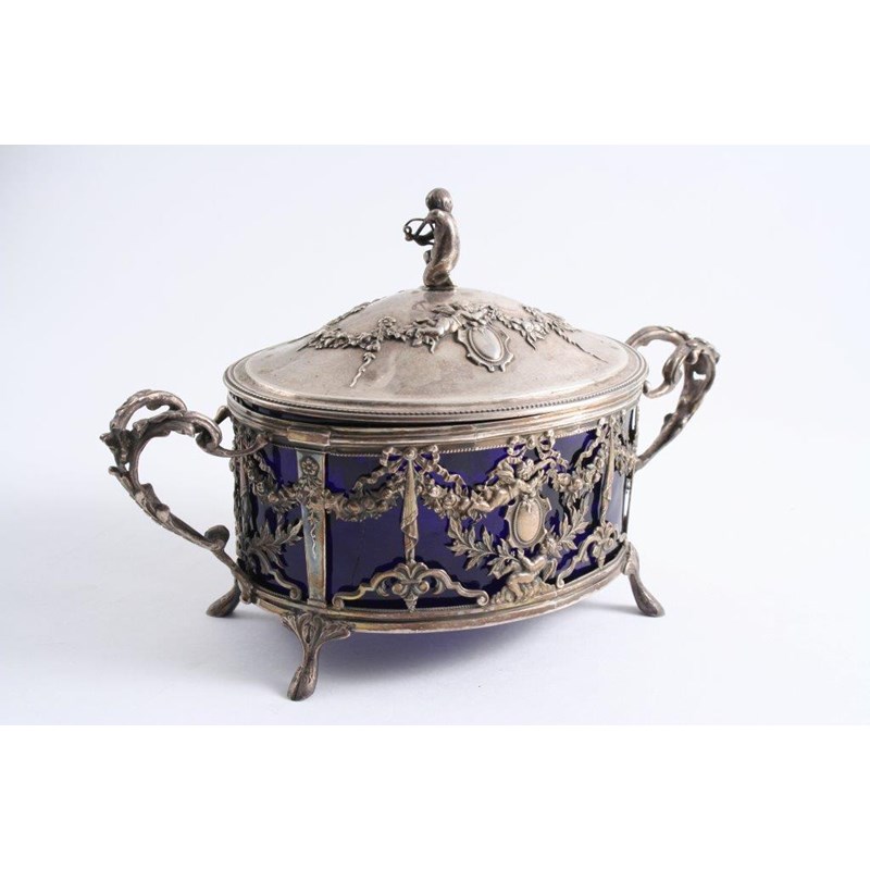 on hoof feet with twin handles & a domed cover with putto finial, blue glass liner (A/F), with small inscription on the base, maker's mark of P. Freres, Paris 1880-1900; 9.1" (23.2 cms) long; 14.3 oz weighable silver