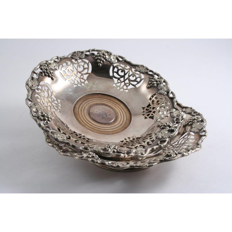 A PAIR OF UNUSUAL VICTORIAN ELECTROPLATED WINE COASTERS with inset, turned wooden bases & pierced bodies with applied fruiting vine borders, crested; 8" (20.2 cms) diameter (2)
