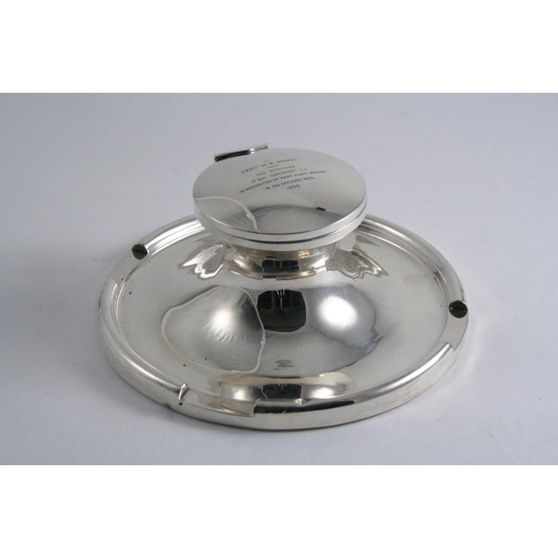 A large Edwardian capstan inkwell with pen rests around the edge, the cover inscribed "To Sergt.W.E. WHALL from the officers, 1st XIII (Somerset) LI in recognition of many years' services in the officer's mess 1909"*, by A & J Zimmerman, Birmingham 1909 (loaded); 8" (20.5 cms) diameter
