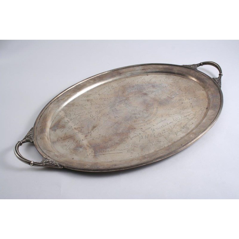 with a reeded border, the centre engraved with the badge of the "6th Duke of Wellington's West Riding Regt.", and numerous facsimile signatures, by William Hutton & Sons Ltd.,Sheffield 1919; 19" (48.5 cms) long; 54.3 oz