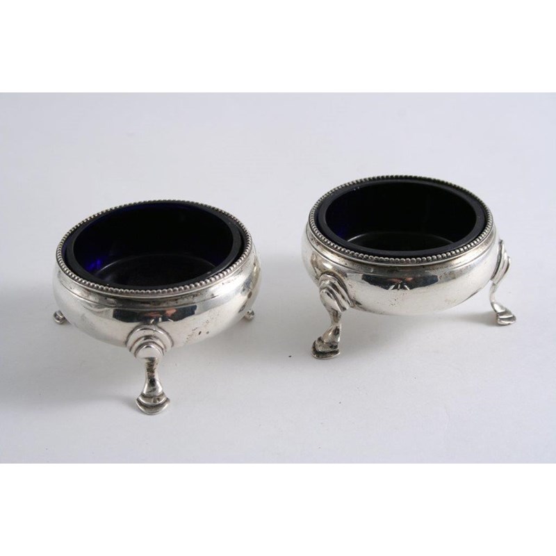 A pair of George III circular salts on three feet with bead borders, blue glass liners & gilt interiors, London 1770; 2.3" (6 cms) diameter; 2.3 oz (2)