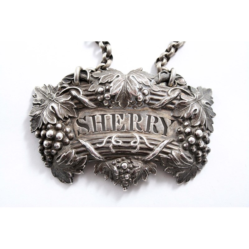 pierced "SHERRY" with raised borders of reeding & fruiting vines, by Rebecca Emes & Edward Barnard, London 1824; 2.5" (6.4 cms) long; 0.9 oz