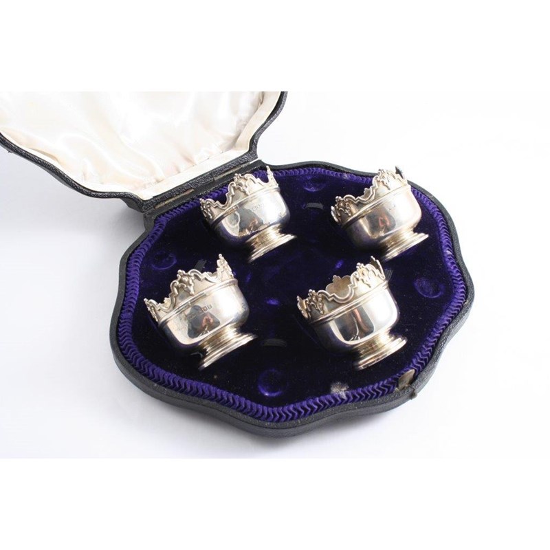 AN EDWARDIAN CASED SET OF FOUR SALTS each in the form of a Monteith bowl, clear glass liners, by Mappin & Webb, London 1905; 2.25" (5.6 cms) diameter each; 5.5 oz weighable silver