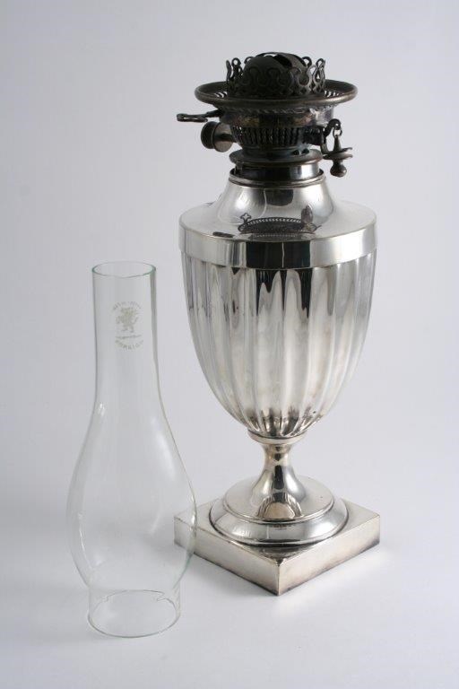 A LATE VICTORIAN ELECTROPLATED OIL LAMP with a fluted, urn-shaped body, a pedestal foot & a glass chimney, c.1900; 24" (61 cms) high overall