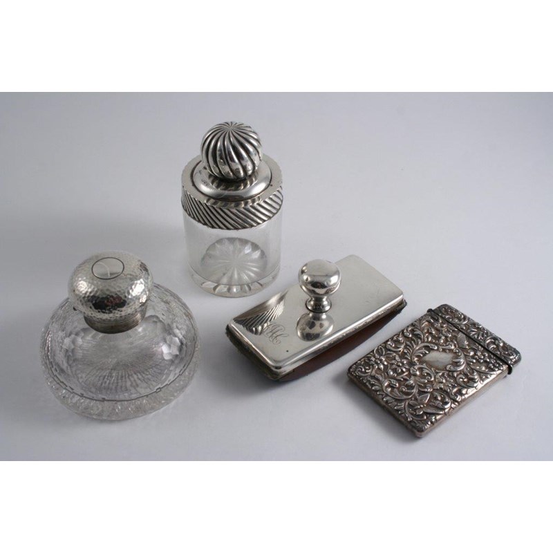 A mounted glass smelling salts bottle with wrythen fluting by S.Mordan & Co., London 1890, a modern mounted wooden blotter, an embossed card case, London 1901 and a mounted, faceted glass, circular inkwell by T. Bradbury & Sons, Sheffield 1906; the latter 4" (10 cms) diameter; 2.5 oz weighable silver (4)