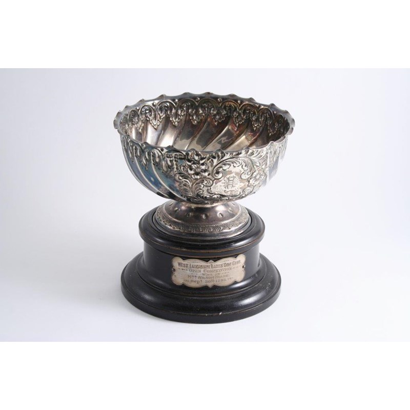 A LATE VICTORIAN EMBOSSED ROSE BOWL monogrammed (with mounted & inscribed wooden plinth) by Atkin Brothers, Sheffield 1894; 8" (20 cms); 13 oz