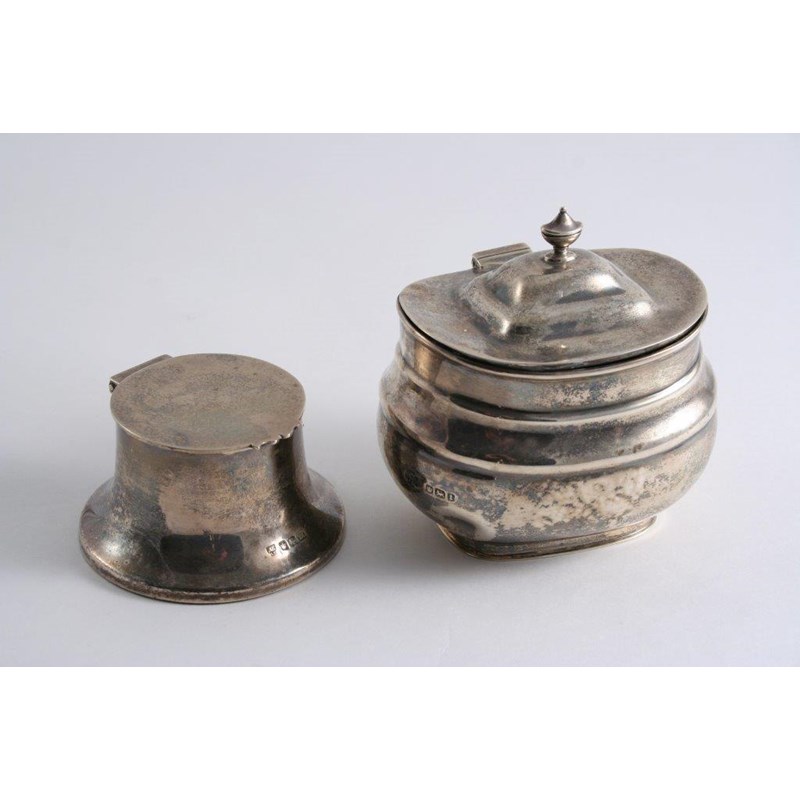 by Messrs. Hutton & Sons, Sheffield 1911 and a small inkwell (glass liner) by Hawkesworth, Eyre & Co., Sheffield 1904 (loaded); the latter 1.7" (4.4 cms) high; 4.4 oz weighable silver (2)