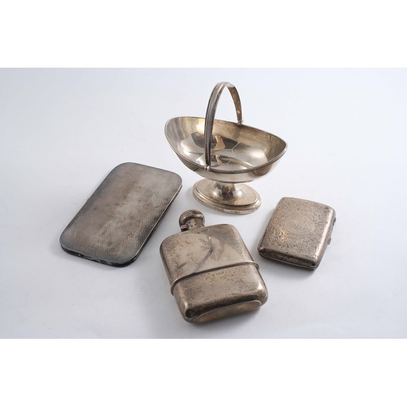 A MIXED LOT: A spirit flask, crested & initialled, a swing handled sugar basket, & two cigarette cases, mixed makers & dates; the flask 5.1" (13 cms) long; 17.5 oz (5)