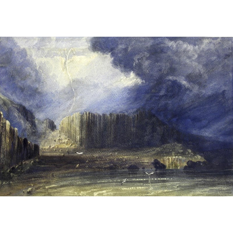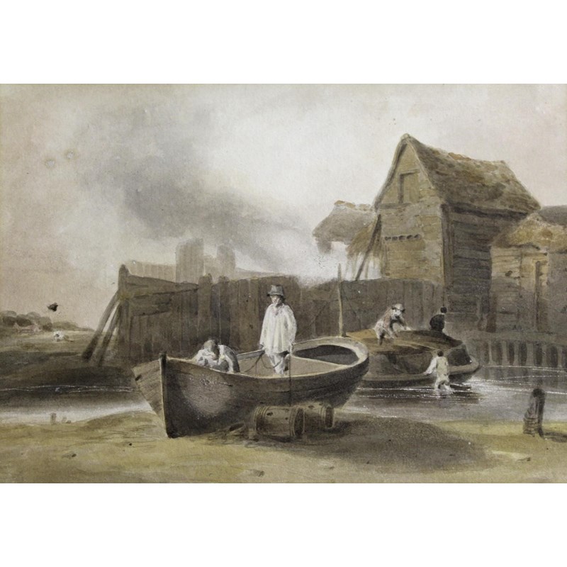 with a watercolour of boatmen in a harbour by Cornelius Varley, framed, 19 x 27cm. (2)