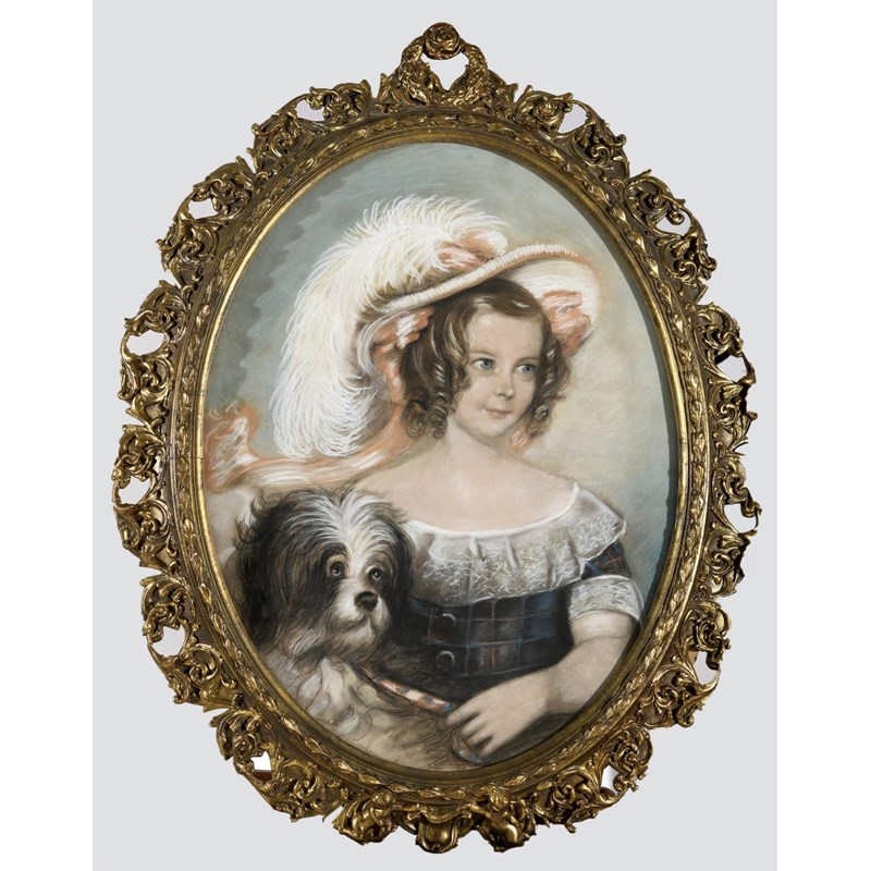 The child in a plaid and lace dress and a feathered hat, pastels and charcoal, oval