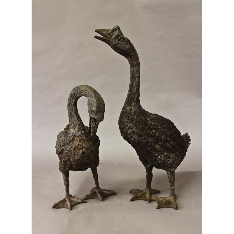 TWO BRONZE EFFECT SCULPTURAL GARDEN GEESE ORNAMENTS, one with head raised, the other lowered, 39 and 54cm high (2)