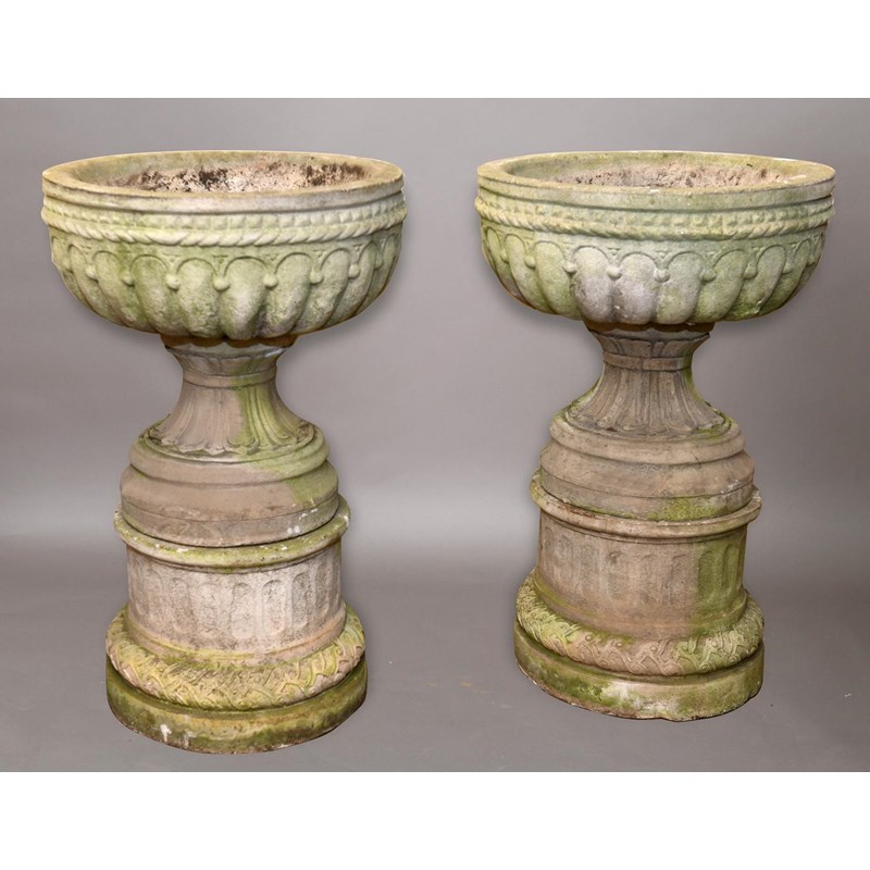 A LARGE PAIR OF RECONSTITUTED STONE PLANTERS ON STANDS, each with a broad dished top with lobed sides on spreading pedestals and column type bases, 89cm high 59cm wide.