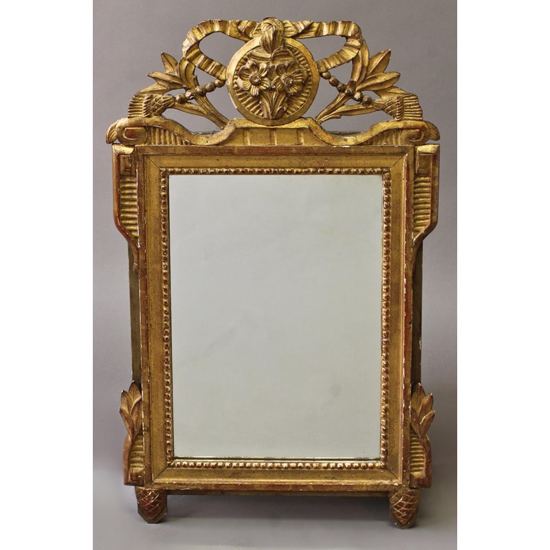 with a rectangular mirror plate within a moulded surround surmounted by a ribbon and foliate cresting, 71cm high 44cm wide.