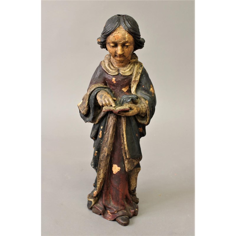 A PAINTED POLYCHROME SHRINE FIGURE, the female figure wearing red and green flowing dress and cloak, the figure with a hole to the reverse and top of her head, 48cm high.