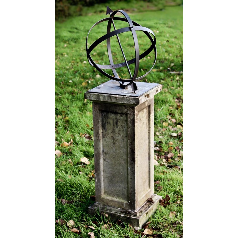 the globe with arrow pointer on a square base with engraved text, N S E W symbols and floral decoration, on a reconstituted stone square section base, 122cm high 32cm wide.