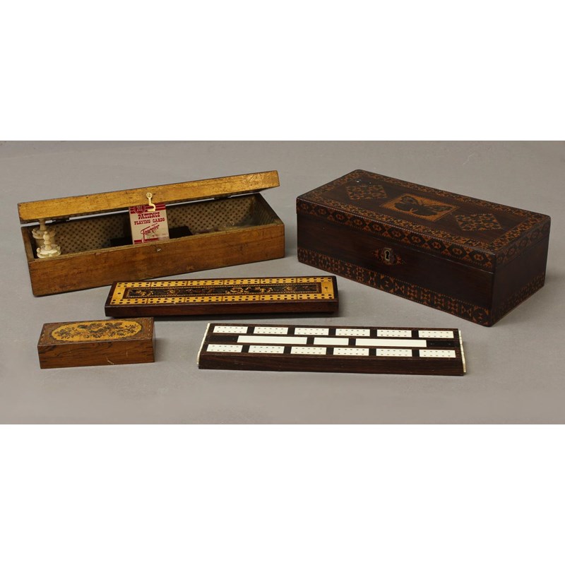 A TUNBRIDGE WARE BOX AND SIMILAR CRIBBAGE BOARDS ETC.