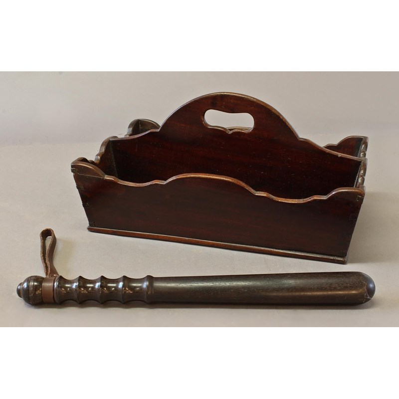 the knife box with pierced handle, two divisions and sloping sides with wavy edges, 18cm high, 38cm wide, together with a turned wooden truncheon with leather strap, 40cm. (2)