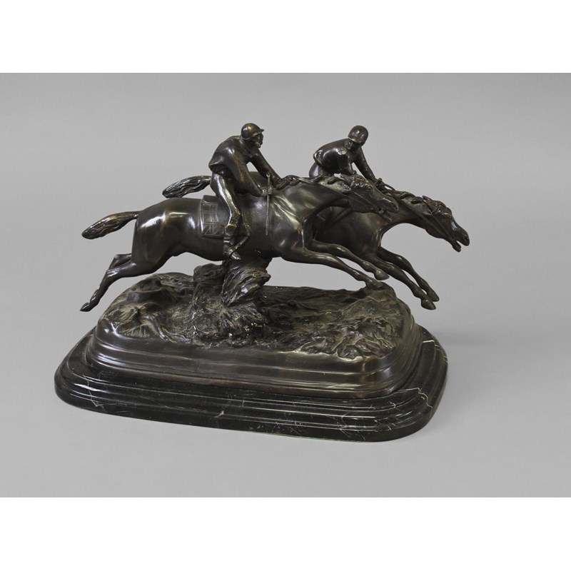 A 19TH CENTURY STYLE BRONZE OF RACING JOCKEYS, two racing jockeys jumping a fence, cast and patinated on a naturalistic base with indistinct signature, on a variegated marble base. 29cm high 41cm wide.