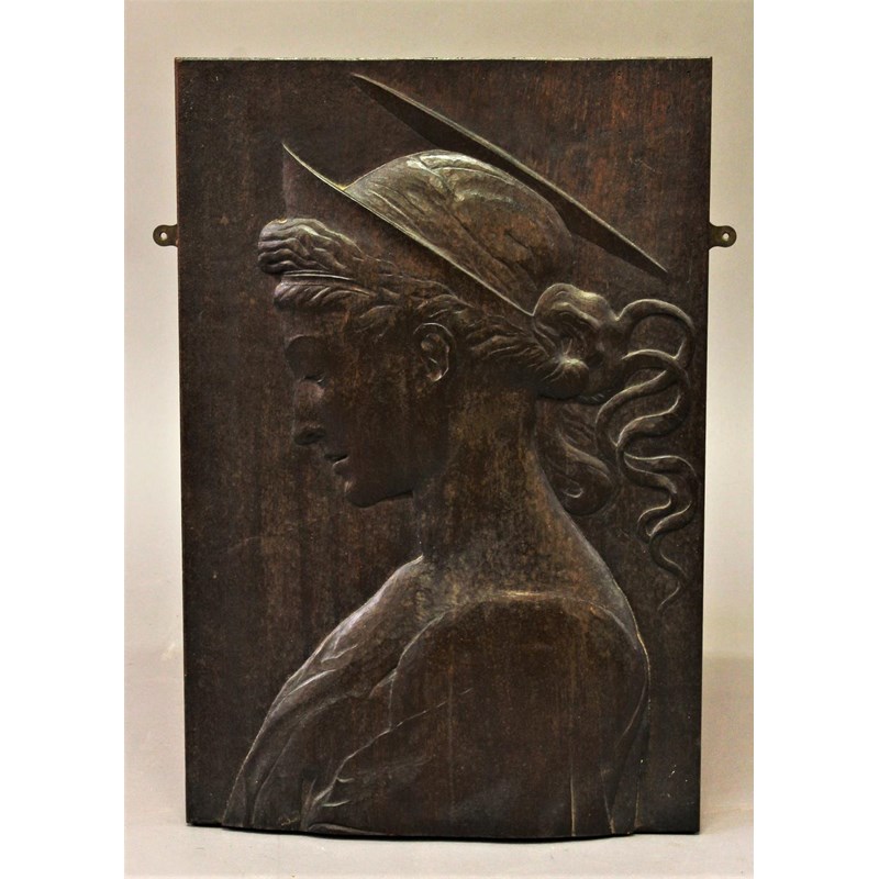 a rectangular mahogany panel carved in low relief with a female saint or similar figure with a halo and headpiece, her hair tied in a bunch, late 19th/20th century, the panel 60x 40cm.