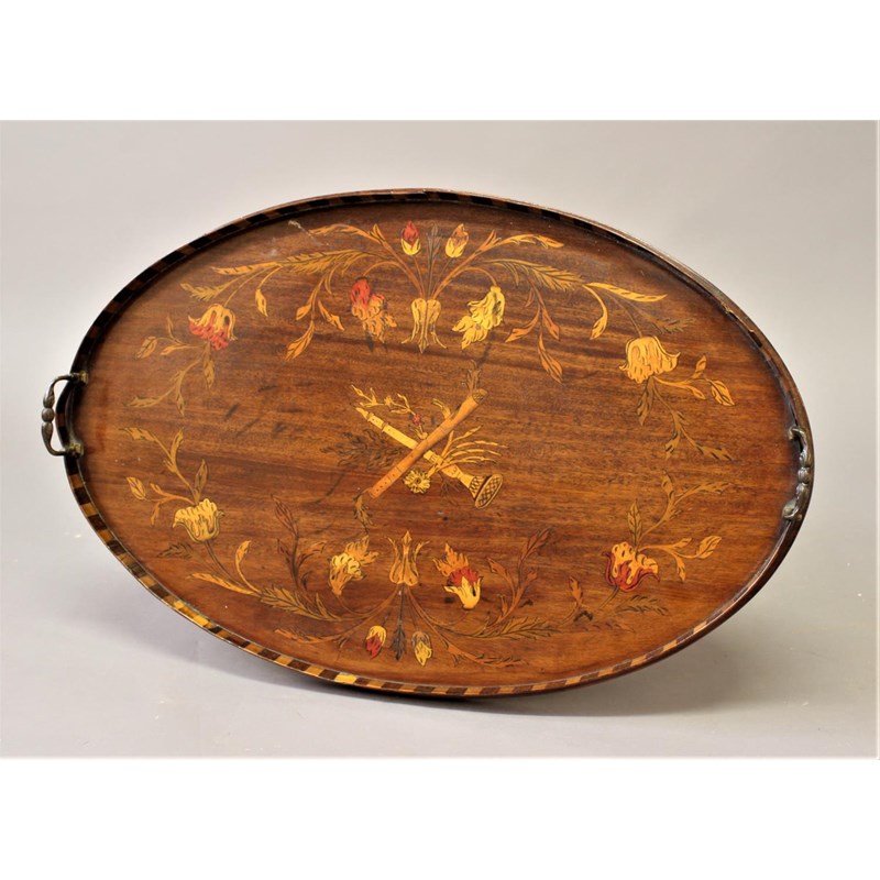 with a chequered raised border and twin carrying handles, the surface inlaid with a musical trophy surrounded by scrolling foliage, 68cm wide.