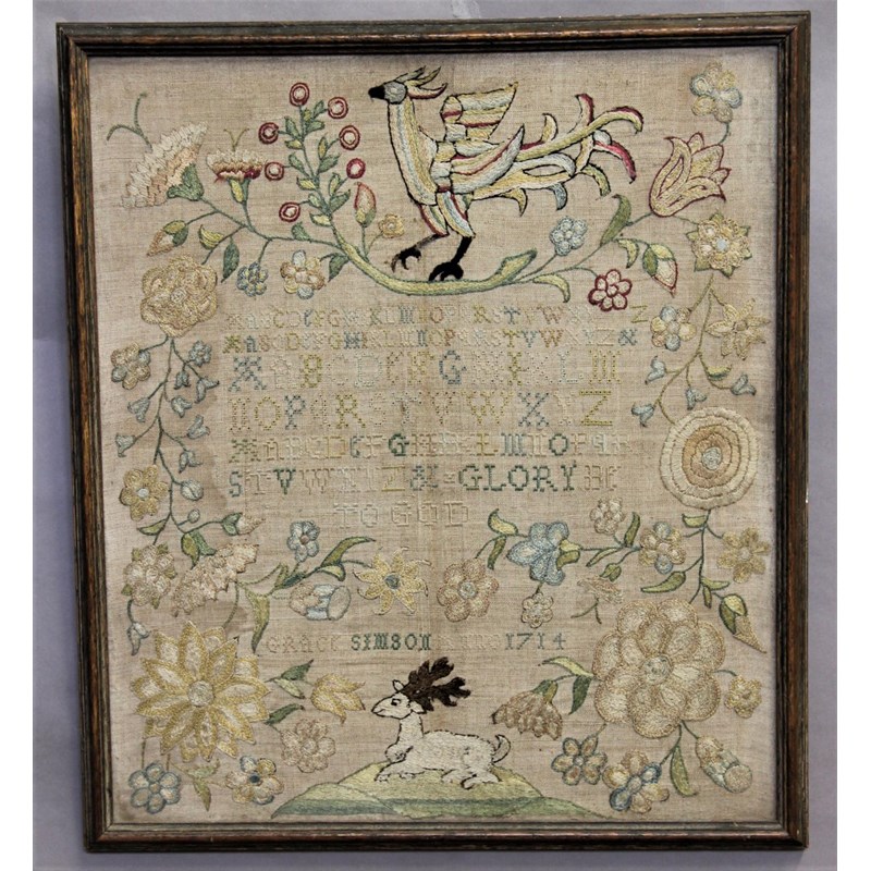 worked with central alphabets and 'Glory be to God' within a scrolling border of decorative flowers, with a HoHo bird above and white hart below, by Grace Simpson, 1714, possibly reworked in places, 36cm x 32cm.